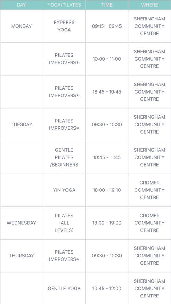 I have been teaching Yoga, Pilates and Fitness in the North Norfolk area for over 20 years, both at a local leisure centre and in local community centres. I have been a qualified shiatsu practitioner since 1997.